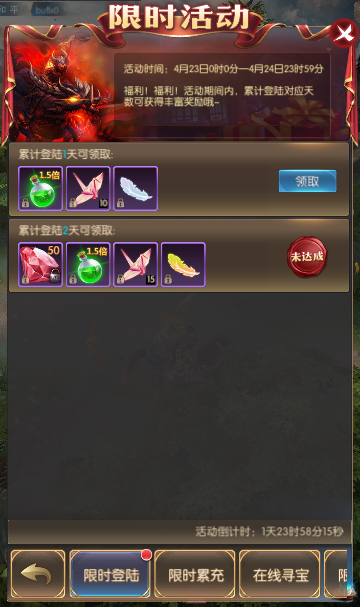 活动简介:福利!福利!活动期间内,累计登陆对应天数可获得丰富奖励哦~