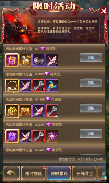 活动简介:活动期间,累计充值达到一定金额,可领取游戏为你准备的返利豪礼