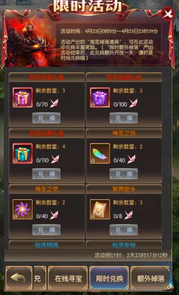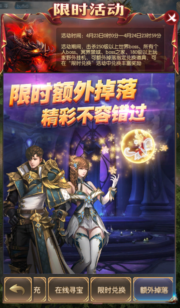 活动简介:活动期间,击杀250级以上世界boss、所有个人boss、冥界禁域、boss之家可额外掉落指定兑换道具,可在“限时兑换”活动中兑换丰富奖励;180级以上玩家野外挂机可额外掉落指定兑换道具,可在“限时兑换”活动中兑换丰富奖励
