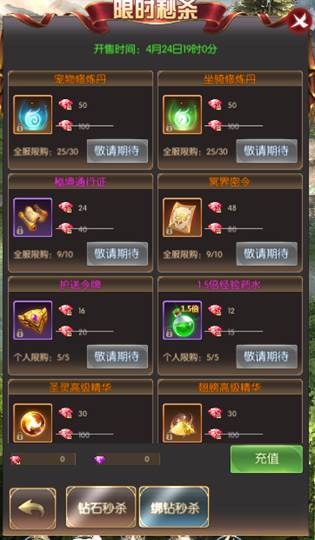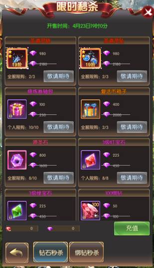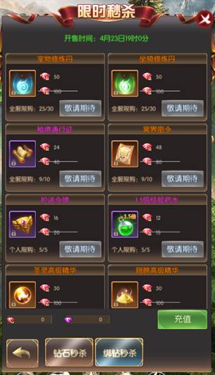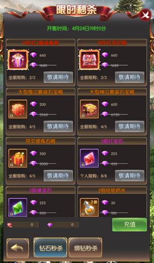 活动简介:活动期间,玩家能以超低的价格秒杀原价道具,机会不容错过。