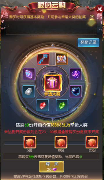 2.云购活动10:00开启购买,在到达14:00之前,玩家可以购买一定份数的云购(可购买份数与VIP等级有关)
