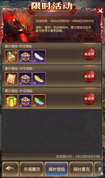 活动简介:福利!福利!活动期间内,累计登陆对应天数可获得丰富奖励哦~