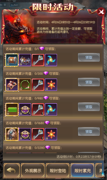 活动简介:活动期间,累计充值达到一定金额,可领取游戏为你准备的返利豪礼