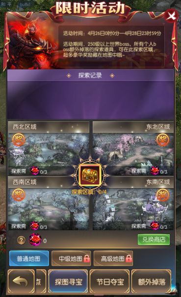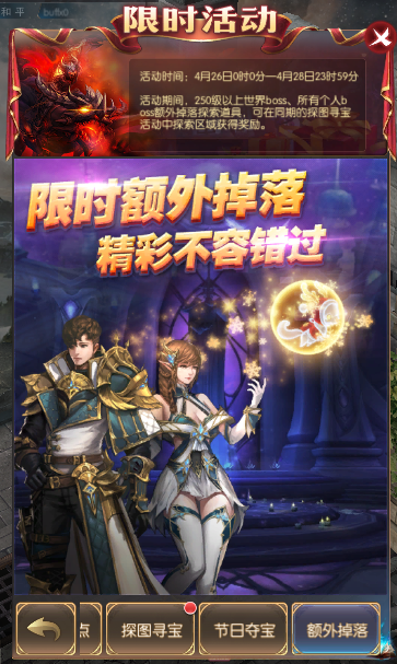 活动简介:活动期间,250级以上世界boss、所有个人boss额外掉落探索道具,可在同期的探图寻宝活动中探索区域获得奖励。