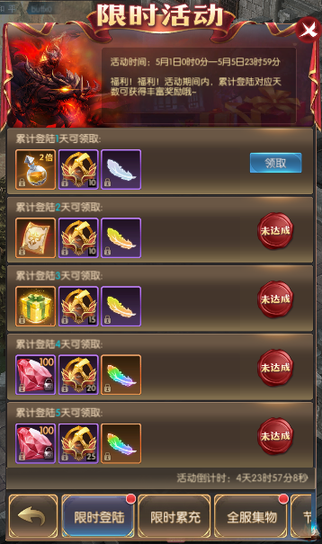 活动简介:福利!福利!活动期间内,累计登陆对应天数可获得丰富奖励哦~