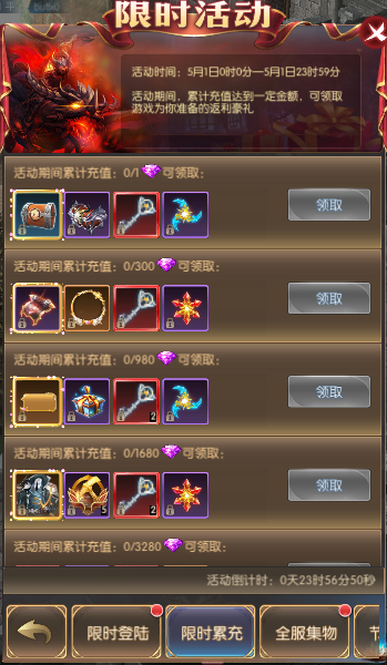 活动简介:活动期间,累计充值达到一定金额,可领取游戏为你准备的返利豪礼
