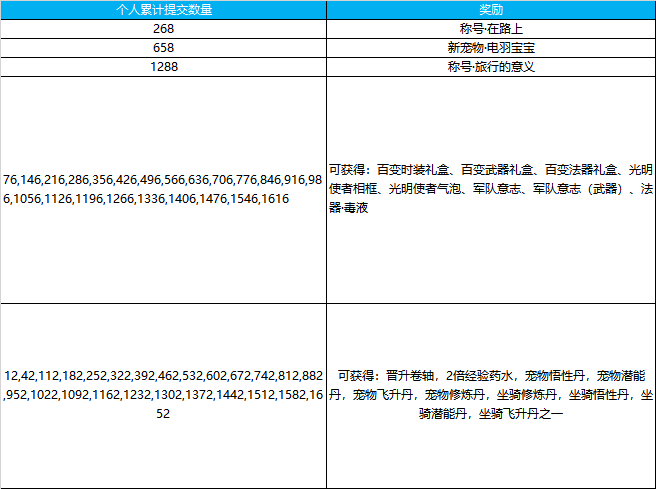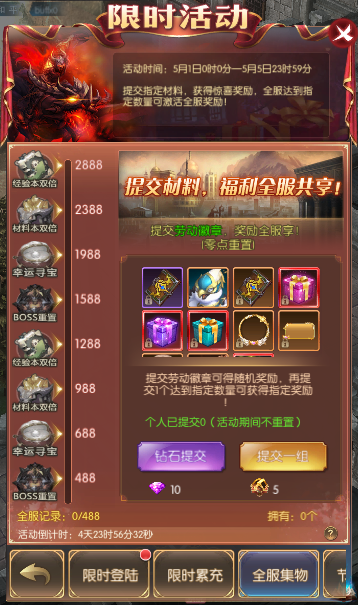 活动简介:提交指定材料,获得惊喜奖励,全服达到指定数量可激活全服奖励!