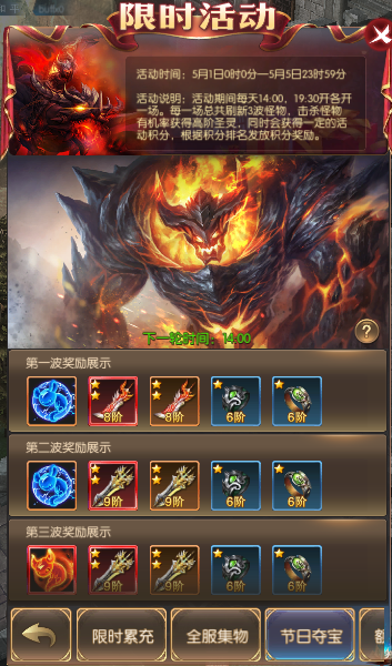 活动简介:活动期间每天14:00,19:30开各开一场。每一场总共刷新3波怪物,击杀怪物有获得高阶圣灵,同时会获得一定的活动积分,根据积分排名发放积分奖励。