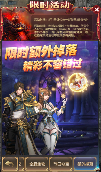 活动简介:活动期间,击杀250级以上世界boss、所有个人boss、冥界禁域、boss之家。180级以上玩家野外挂机有额外掉落指定道具,可在指定全服集物活动中提交获得奖励。