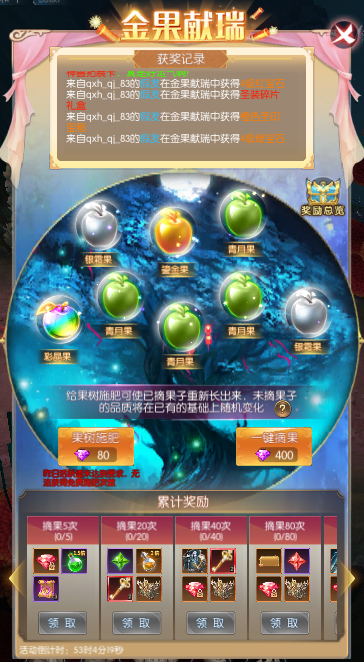 3.果子共分4个等级,1-青月果,2-银霜果,3-鎏金果,4-彩晶果,随等级提升获得稀有奖励的提升,彩晶果必然获得稀有奖励