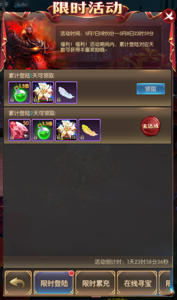 活动简介:福利!福利!活动期间内,累计登陆对应天数可获得丰富奖励哦~