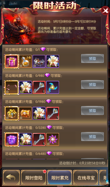 活动简介:活动期间,累计充值达到一定金额,可领取游戏为你准备的返利豪礼