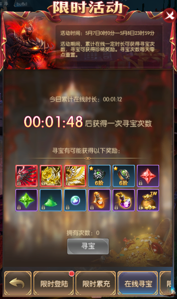 活动简介:活动期间,累计在线一定时常可获得寻宝次数,寻宝可获得珍稀奖励。寻宝次数每天零点重置。
