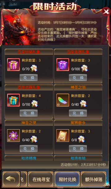 活动简介:活动期间,击杀250级以上世界boss、所有个人boss、冥界禁域、boss之家可额外掉落指定兑换道具,可在“限时兑换”活动中兑换丰富奖励;180级以上玩家野外挂机可额外掉落指定兑换道具,可在“限时兑换”活动中兑换丰富奖励