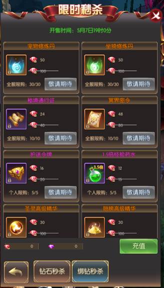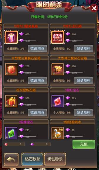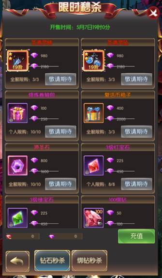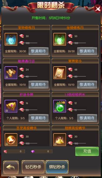 活动简介:活动期间,玩家能以超低的价格秒杀原价道具,机会不容错过。