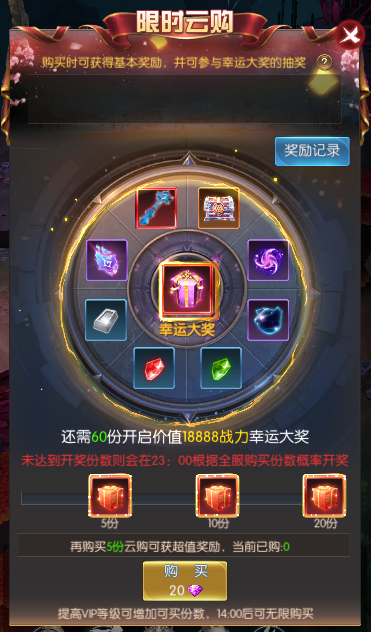 2.云购活动10:00开启购买,在到达14:00之前,玩家可以购买一定份数的云购(可购买份数与VIP等级有关)
