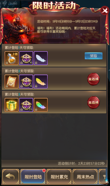 累计登陆3天 | 疲劳礼盒,热点*25,神圣之羽 |