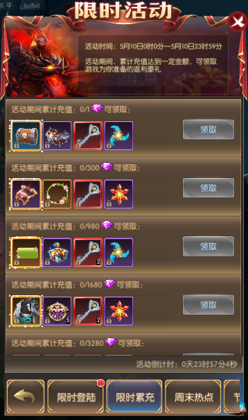 活动简介:活动期间,累计充值达到一定金额,可领取游戏为你准备的返利豪礼