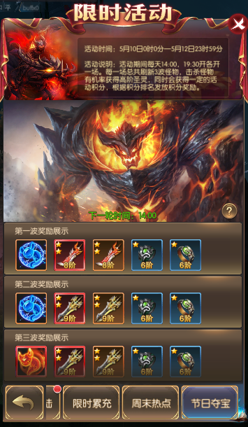 活动简介:活动期间每天14:00,19:30开各开一场。每一场总共刷新3波怪物,击杀怪物有获得高阶圣灵,同时会获得一定的活动积分,根据积分排名发放积分奖励。