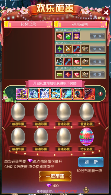 活动简介:活动期间,点击彩蛋即可砸开彩蛋,获得奖励;每次刷新有出现"普通彩蛋","高级彩蛋","特级彩蛋";砸蛋达到一定次数还能获得额外奖励。
