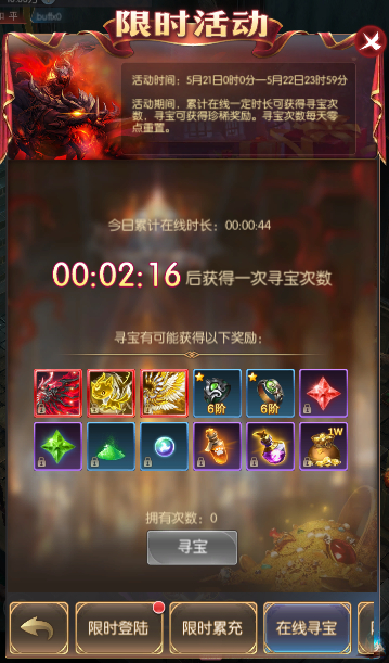 活动简介:活动期间,累计在线一定时常可获得寻宝次数,寻宝可获得珍稀奖励。寻宝次数每天零点重置。