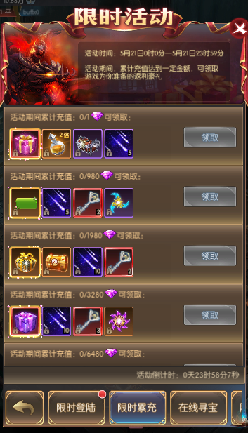 活动简介:活动期间,累计充值达到一定金额,可领取游戏为你准备的返利豪礼
