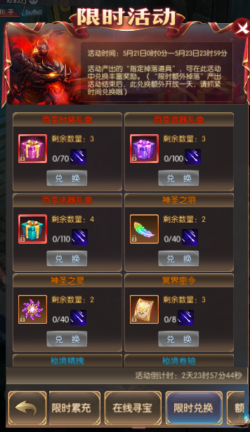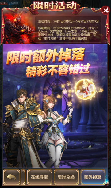 活动简介:活动期间,击杀250级以上世界boss、所有个人boss、冥界禁域、boss之家可额外掉落指定兑换道具,可在“限时兑换”活动中兑换丰富奖励;180级以上玩家野外挂机可额外掉落指定兑换道具,可在“限时兑换”活动中兑换丰富奖励