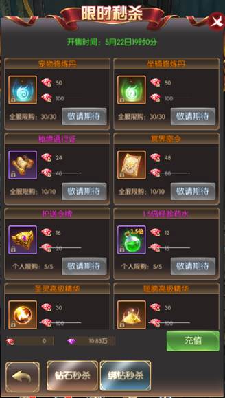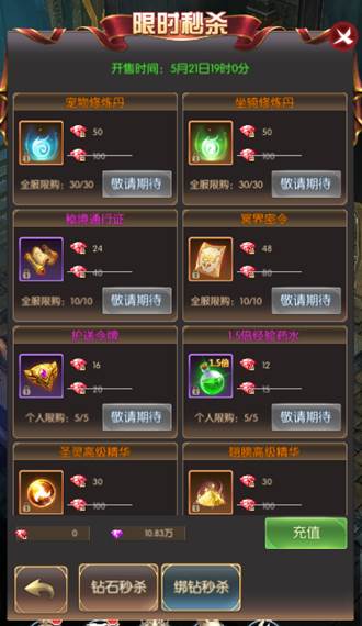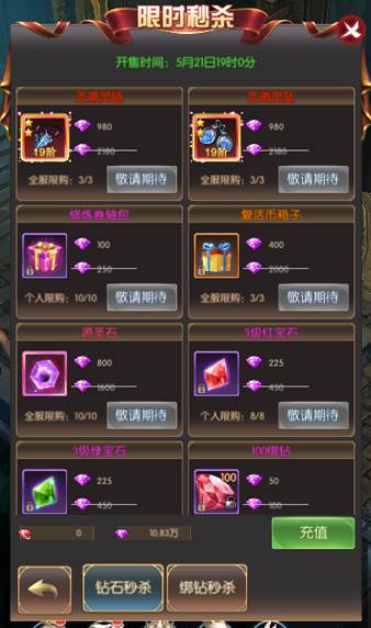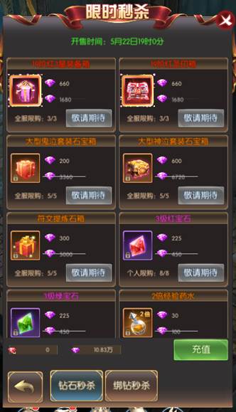 活动简介:活动期间,玩家能以超低的价格秒杀原价道具,机会不容错过。