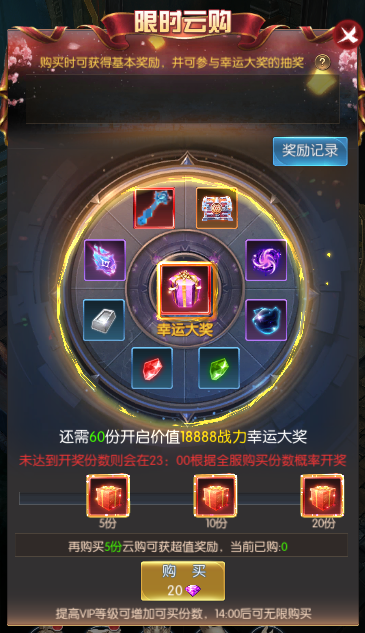 2.云购活动10:00开启购买,在到达14:00之前,玩家可以购买一定份数的云购(可购买份数与VIP等级有关)
