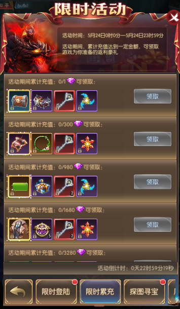活动简介:活动期间,累计充值达到一定金额,可领取游戏为你准备的返利豪礼