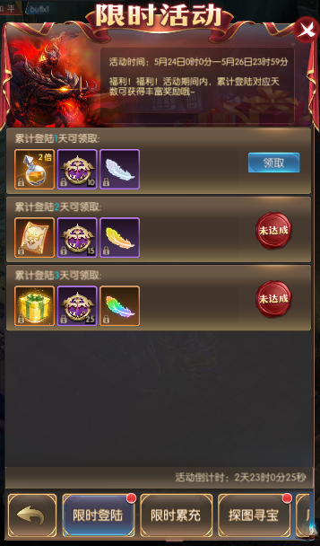 活动简介:福利!福利!活动期间内,累计登陆对应天数可获得丰富奖励哦~