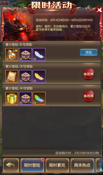 累计登陆3天 | 疲劳礼盒,热点*25,神圣之羽 |
