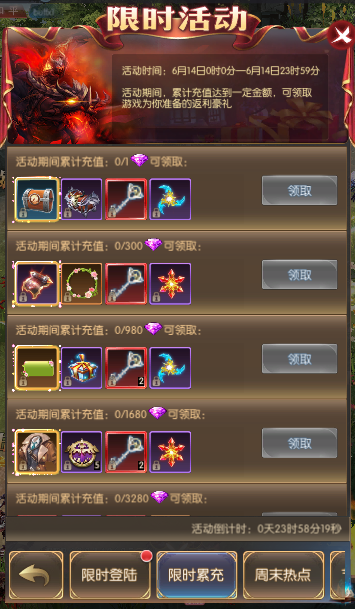 活动简介:活动期间,累计充值达到一定金额,可领取游戏为你准备的返利豪礼