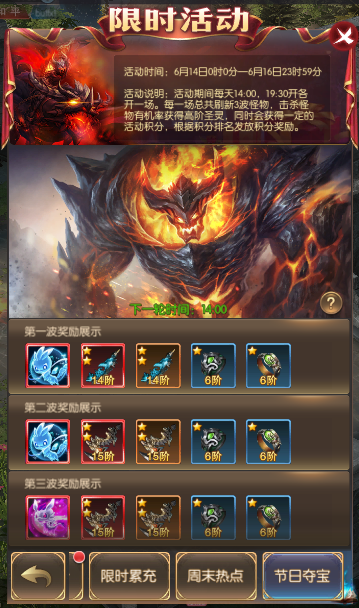 活动简介:活动期间每天14:00,19:30开各开一场。每一场总共刷新3波怪物,击杀怪物有获得高阶圣灵,同时会获得一定的活动积分,根据积分排名发放积分奖励。