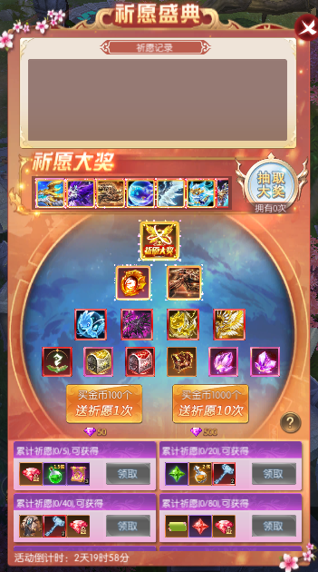 活动简介:活动期间可以消耗钻石购买金币进行祈愿,每次购买会赠送一个祈愿奖励 ;在奖池中抽到祈愿盛典大奖后,可在上方祈愿大奖奖池中抽取一次极品奖励(必然获得奖池中的极品奖励之一) ;祈愿达到累计次数可以获得对应的次数奖励,奖励多多 ;活动期间祈愿累计次数不会重置,活动结束后重置