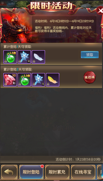 活动简介:福利!福利!活动期间内,累计登陆对应天数可获得丰富奖励哦~