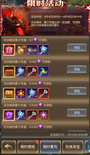 活动简介:活动期间,累计充值达到一定金额,可领取游戏为你准备的返利豪礼