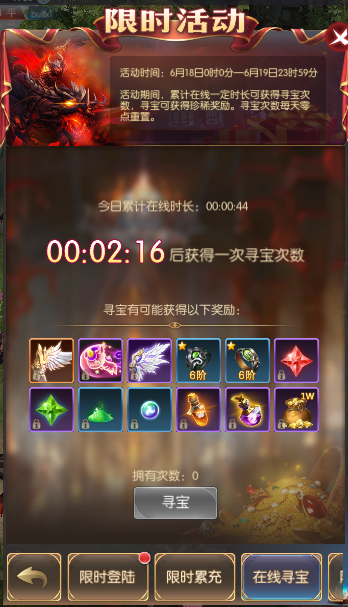 活动简介:活动期间,累计在线一定时常可获得寻宝次数,寻宝可获得珍稀奖励。寻宝次数每天零点重置。