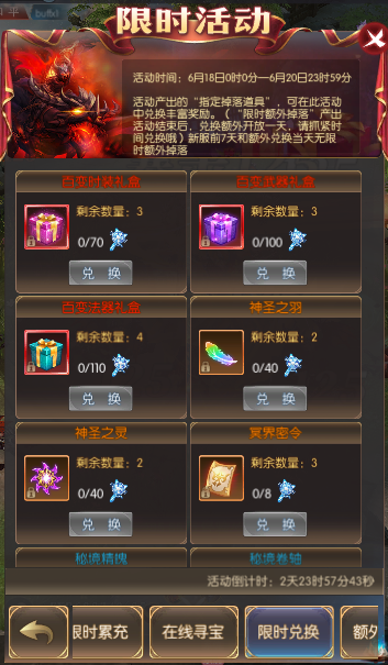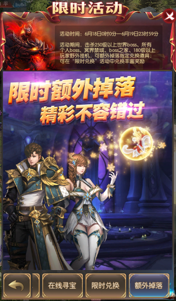 活动简介:活动期间,击杀250级以上世界boss、所有个人boss、冥界禁域、boss之家可额外掉落指定兑换道具,可在“限时兑换”活动中兑换丰富奖励;180级以上玩家野外挂机可额外掉落指定兑换道具,可在“限时兑换”活动中兑换丰富奖励
