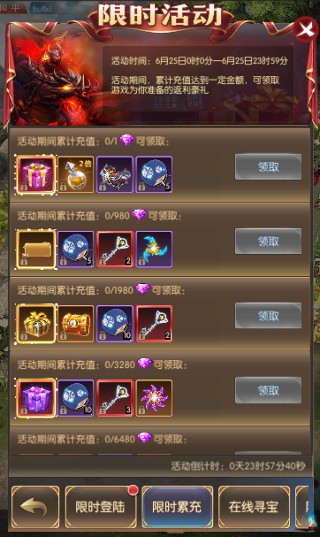 活动简介:活动期间,累计充值达到一定金额,可领取游戏为你准备的返利豪礼
