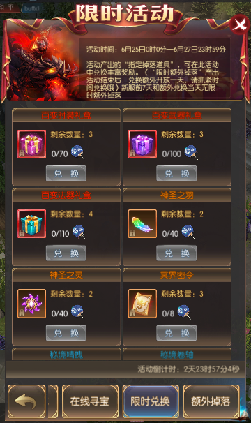 活动简介:活动期间,击杀250级以上世界boss、所有个人boss、冥界禁域、boss之家可额外掉落指定兑换道具,可在“限时兑换”活动中兑换丰富奖励;180级以上玩家野外挂机可额外掉落指定兑换道具,可在“限时兑换”活动中兑换丰富奖励
