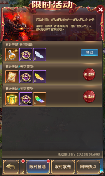 活动简介:福利!福利!活动期间内,累计登陆对应天数可获得丰富奖励哦~