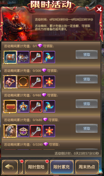 活动简介:活动期间,累计充值达到一定金额,可领取游戏为你准备的返利豪礼