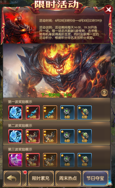 活动简介:活动期间每天14:00,19:30开各开一场。每一场总共刷新3波怪物,击杀怪物有获得高阶圣灵,同时会获得一定的活动积分,根据积分排名发放积分奖励。