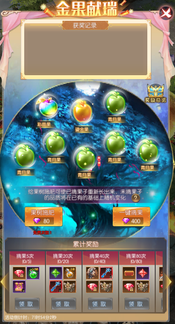 1.点击果树上的果子可以摘下果子,获得对应的奖励