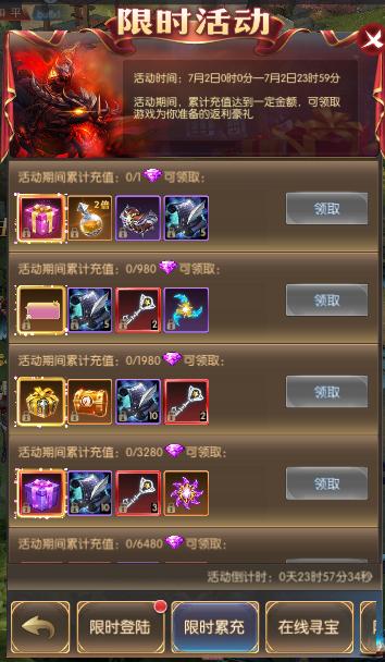 活动简介:活动期间,累计充值达到一定金额,可领取游戏为你准备的返利豪礼
