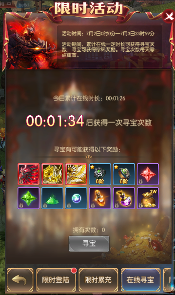 活动简介:活动期间,累计在线一定时常可获得寻宝次数,寻宝可获得珍稀奖励。寻宝次数每天零点重置。