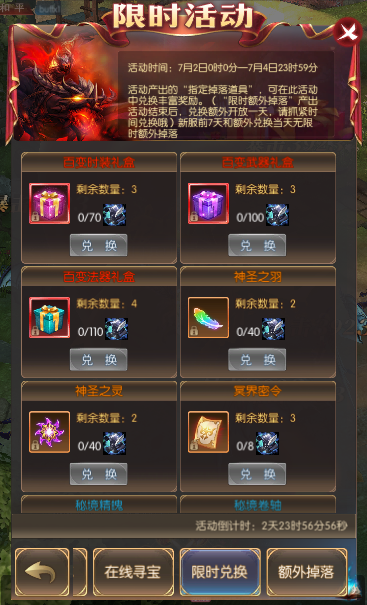 活动简介:活动期间,击杀250级以上世界boss、所有个人boss、冥界禁域、boss之家可额外掉落指定兑换道具,可在“限时兑换”活动中兑换丰富奖励;180级以上玩家野外挂机可额外掉落指定兑换道具,可在“限时兑换”活动中兑换丰富奖励