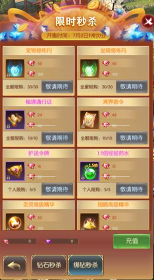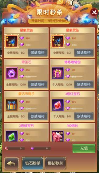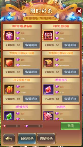 活动简介:活动期间,玩家能以超低的价格秒杀原价道具,机会不容错过。