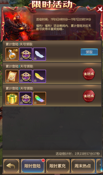 活动简介:福利!福利!活动期间内,累计登陆对应天数可获得丰富奖励哦~